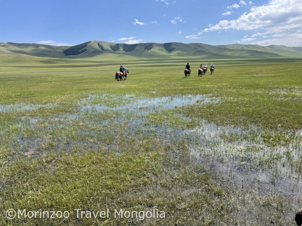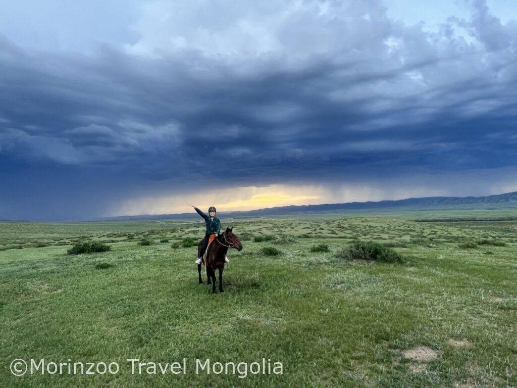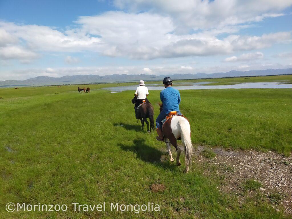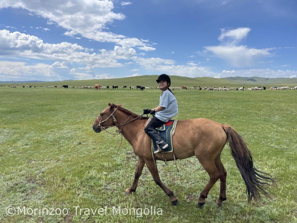 午前:モンゴル馬の扱い方・鞍や馬具の説明を受け、草原で軽く乗馬体験(約20〜30分)。