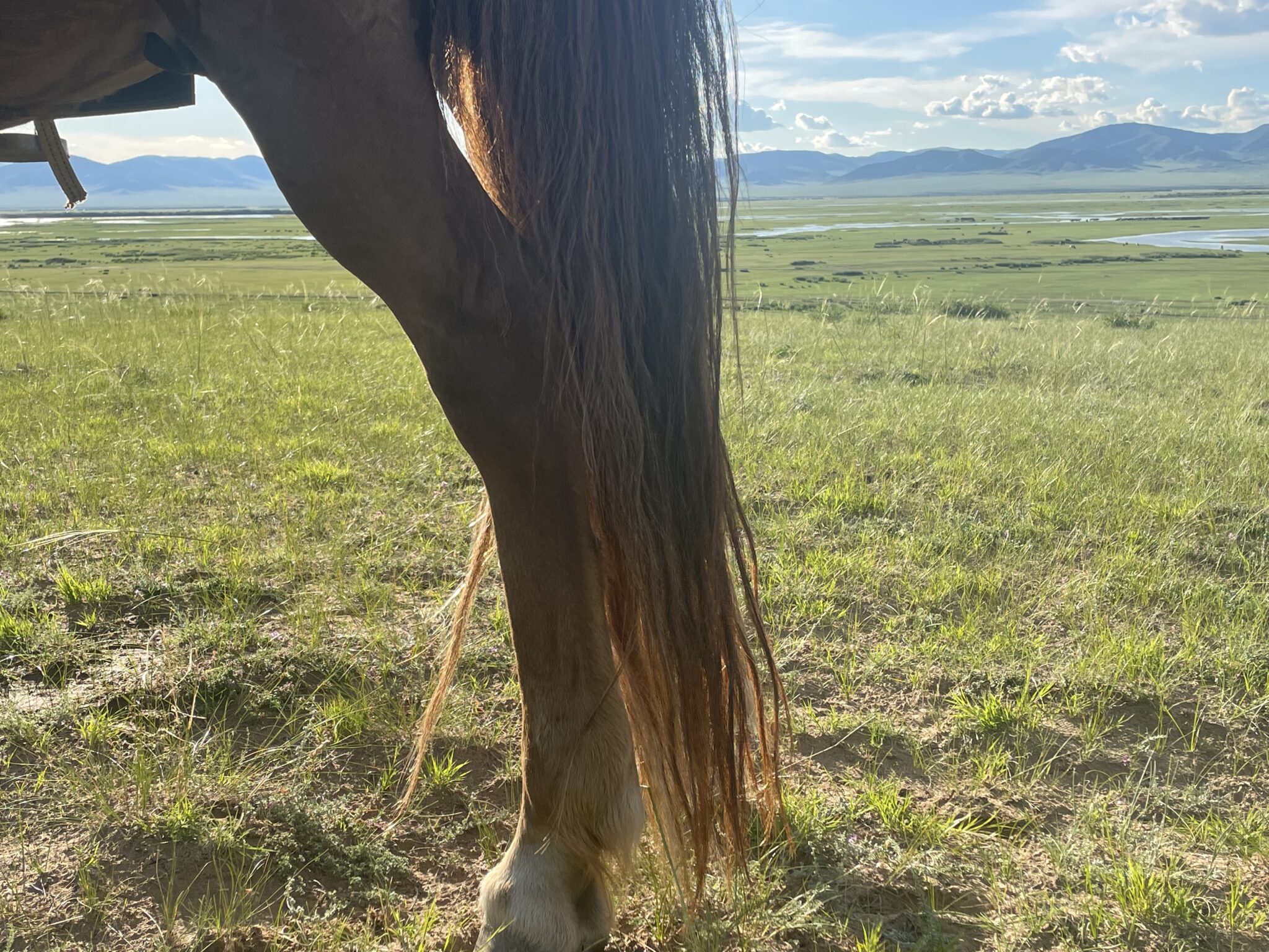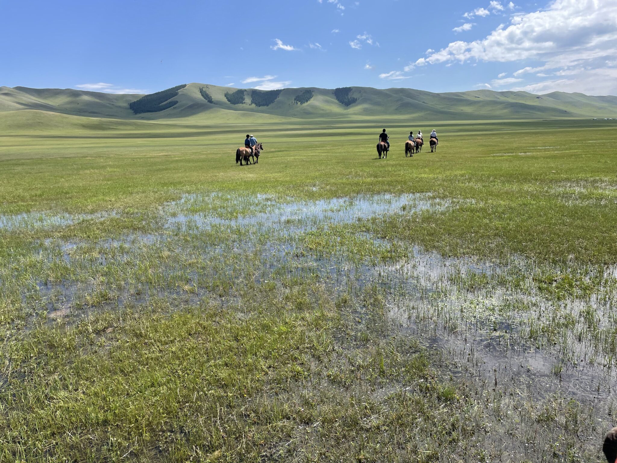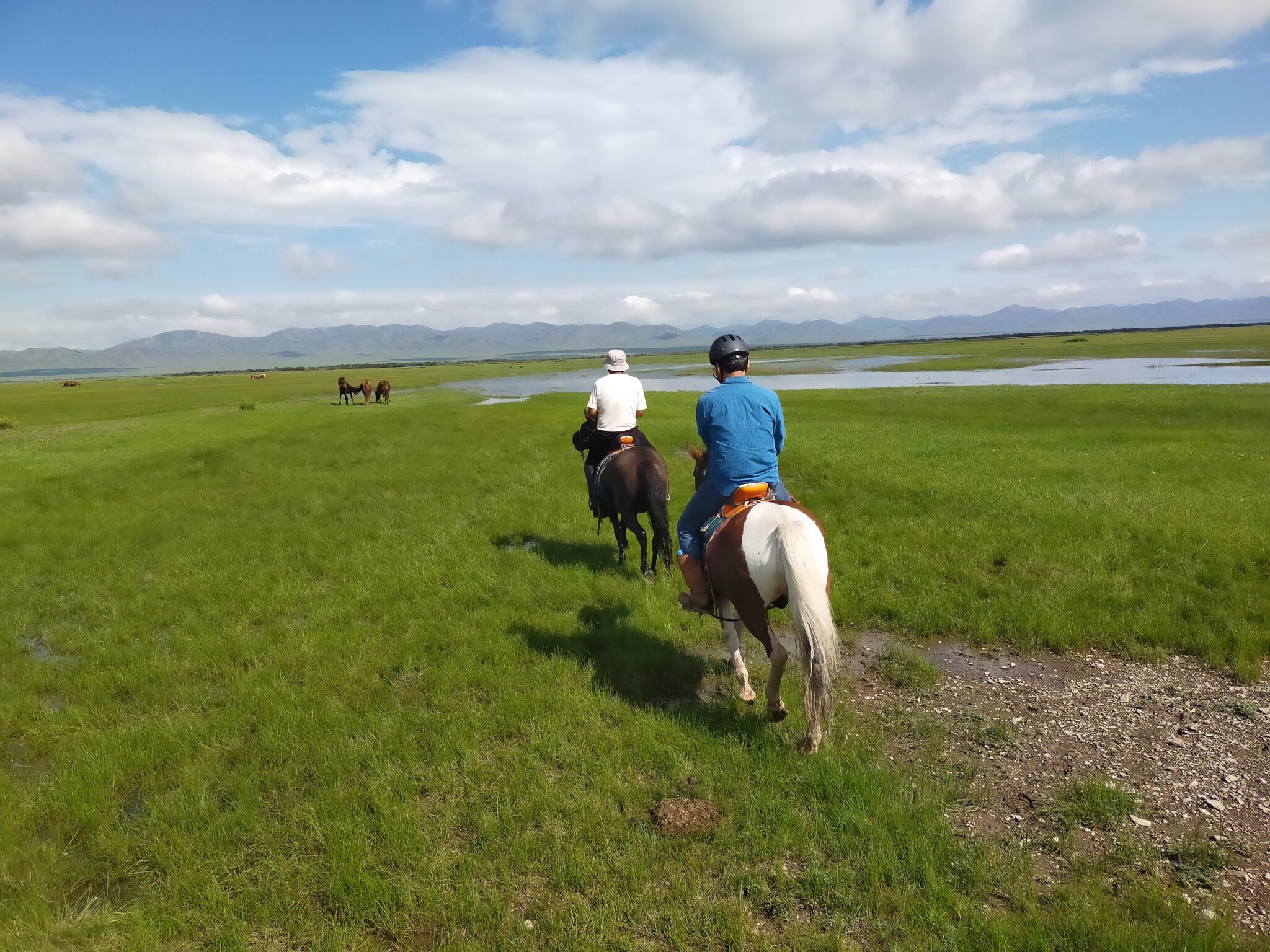 午前:モンゴル馬の扱い方・鞍や馬具の説明を受け、草原で軽く乗馬体験(約20〜30分)。